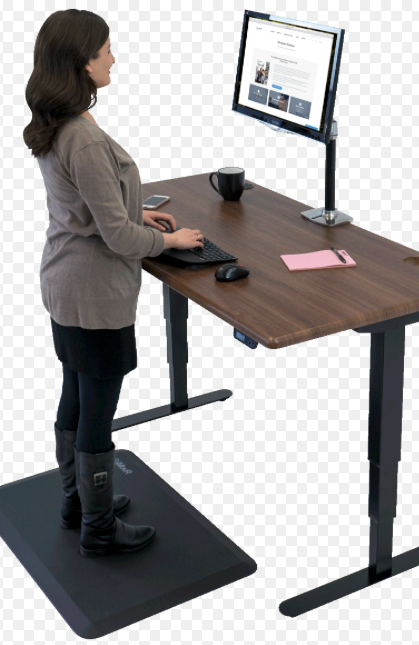 Unfortunately, many of us sit to work. This puts a big strain on our muscles, tendons, ligaments and bones, since humans were not designed to sit still for hours at a time (ask any elementary school child.) If you are held in one place at work (sorry) do as much as you can to move around, stretch and change positions during those 8’ish hours. There’s a small difference in energy burned from sitting to standing (a 155# person sitting burns 45 cal/hr, standing: 47 cal/hr, this link provides energy required for various activities) , so I think the biggest benefit of standing desks is the fact that they allow you to move and stretch, change positions easily, and not get all accordioned-up in the hip flexors. If you are standing on a concrete floor, a fatigue mat will help. But standing out of alignment for a long time will be just as uncomfortable and damaging as sitting all day, so be sure that your screen and keyboard are placed so that the neck, shoulders, elbows and wrists are neutral and aligned. Best approach: remember elementary school? You were right: fidget. Move around A LOT. Balance. Stand on one foot. Stretch. Don’t get stuck in one position for longer than an hour, and alternate between sitting and standing. Use an alarm on your computer. Drink a lot of water and walk to the restroom for mental and body breaks. Keep the blood moving, not pooling in your lower extremities. And don’t work through your breaks. Take them and use them healthfully. The old adage is true: simply move it or lose it.